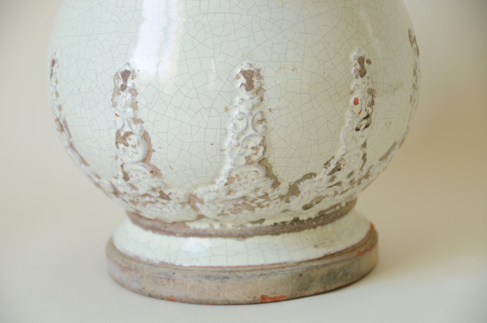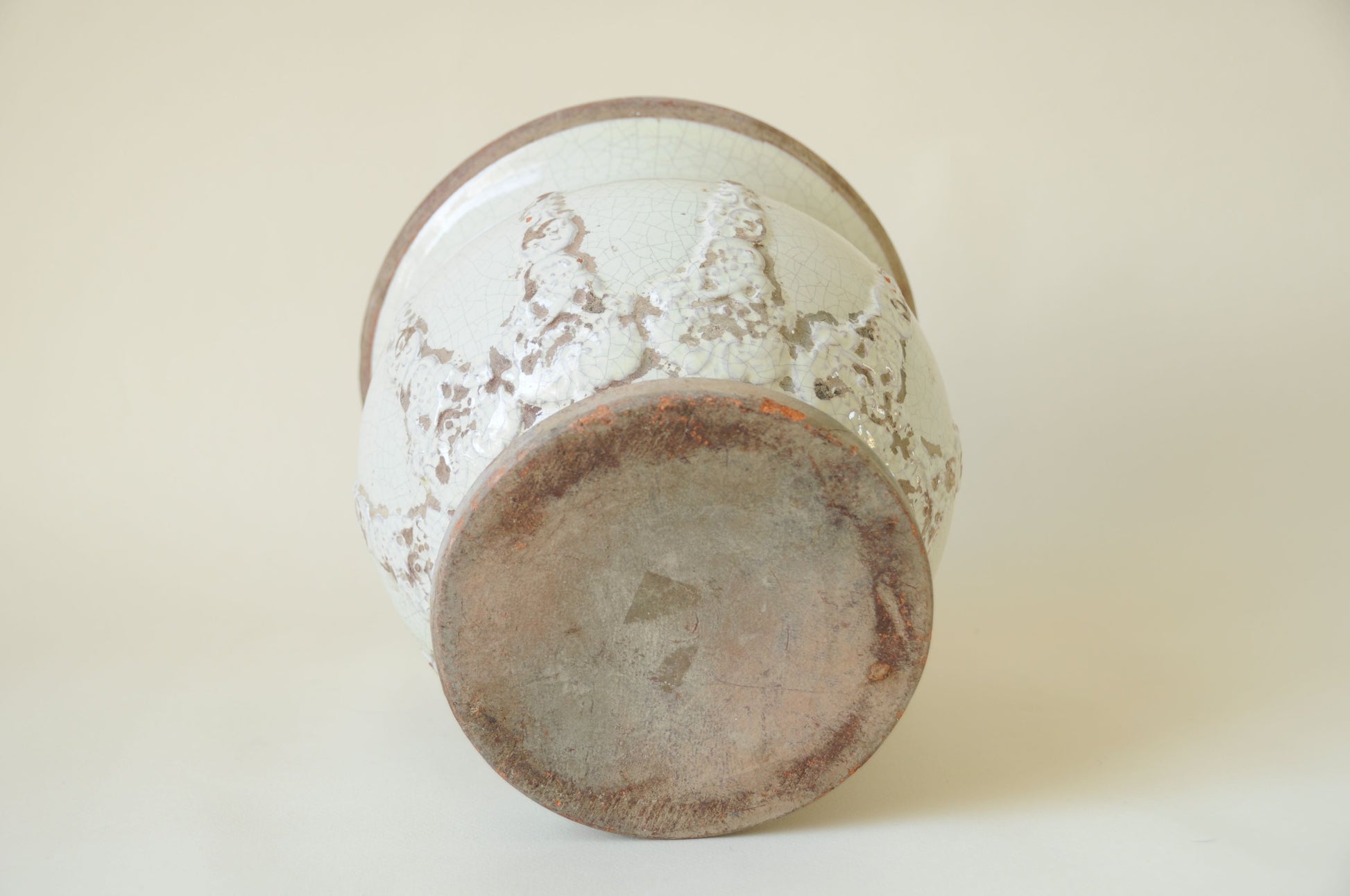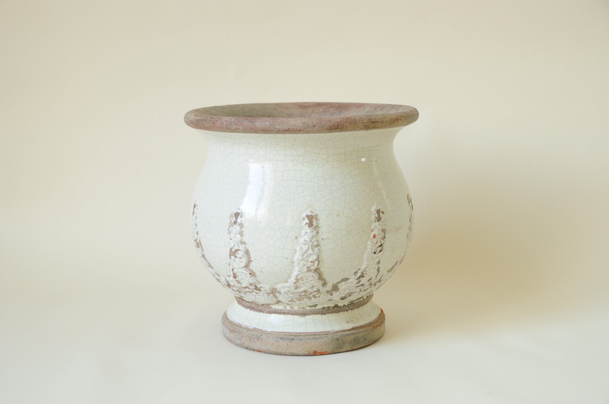 Jardinière cache pot sur pied en terre cuite avec détails en relief et émail blanc cassé aux nuances naturelles. Sa finition craquelée et sa patine délicatement vieillie lui confèrent un aspect ancien plein de caractère.