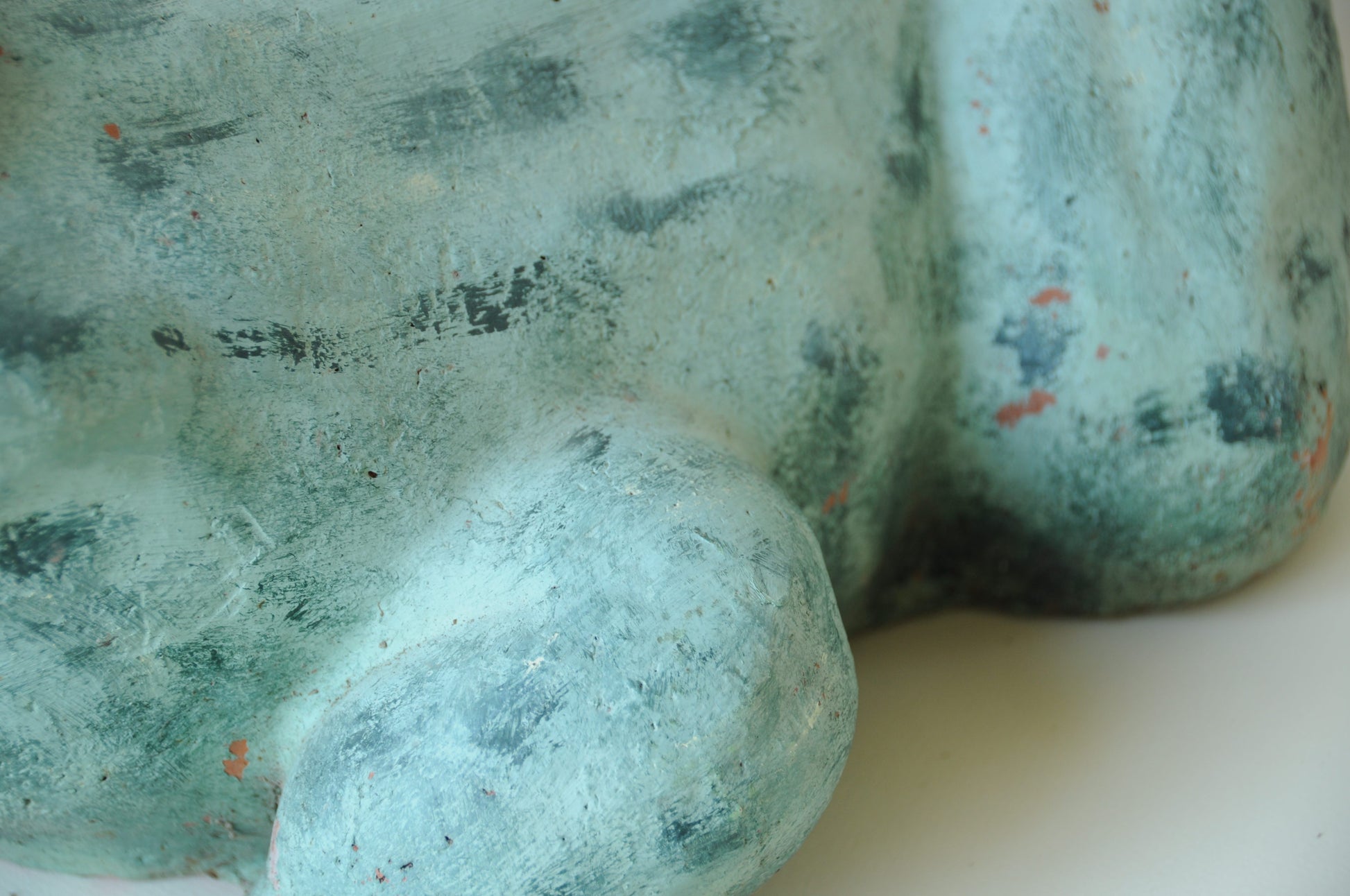 Grosse grenouille en terre cuite peinte couleur vert d'eau qui patiné avec le temps. Idéal décoration originale et insolite pour le jardin ou l'intérieur.